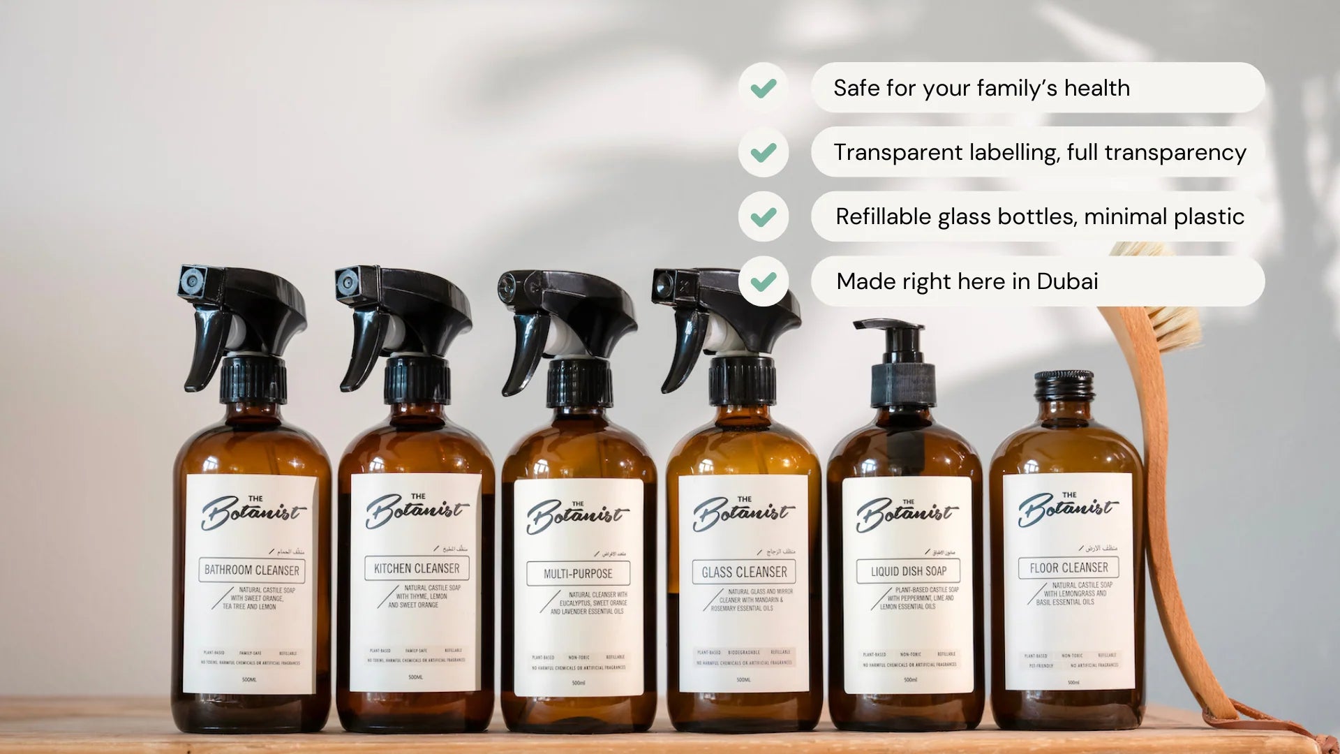 From those first kitchen experiments to today’s small-batch facility in Dubai, our mission hasn’t changed. Every product is still crafted with care, designed to cut toxins and bring peace of mind into homes. Local, sustainable, and family-focused, that’s The Botanist way.